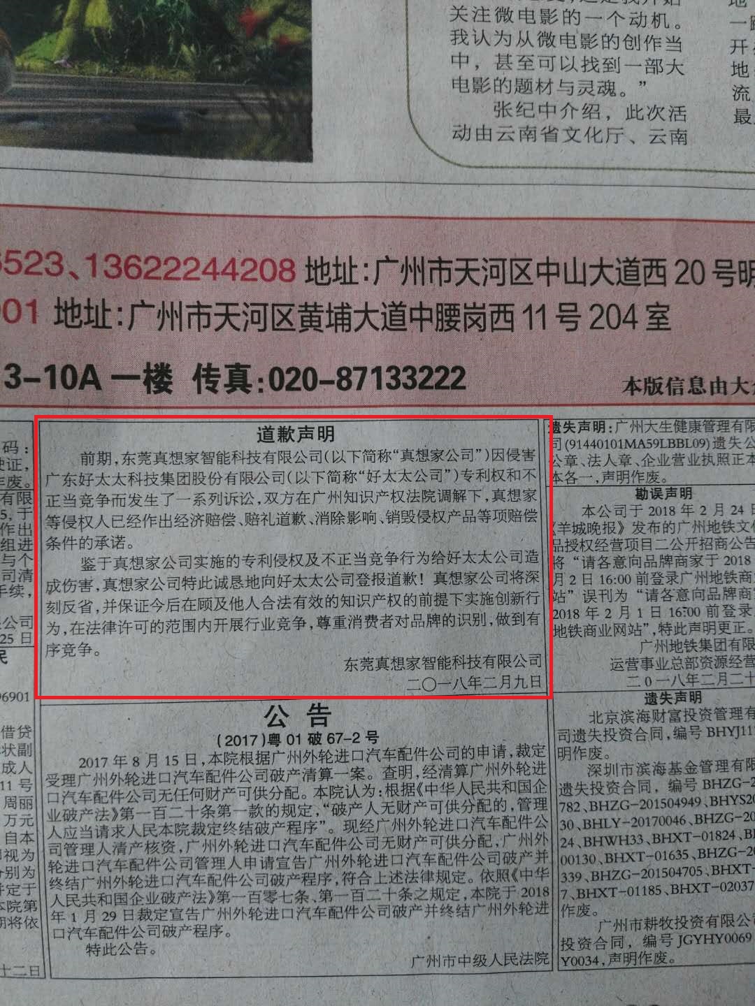 侵權(quán)企業(yè)“真想家”在《羊城晚報(bào)》刊登道歉聲明。