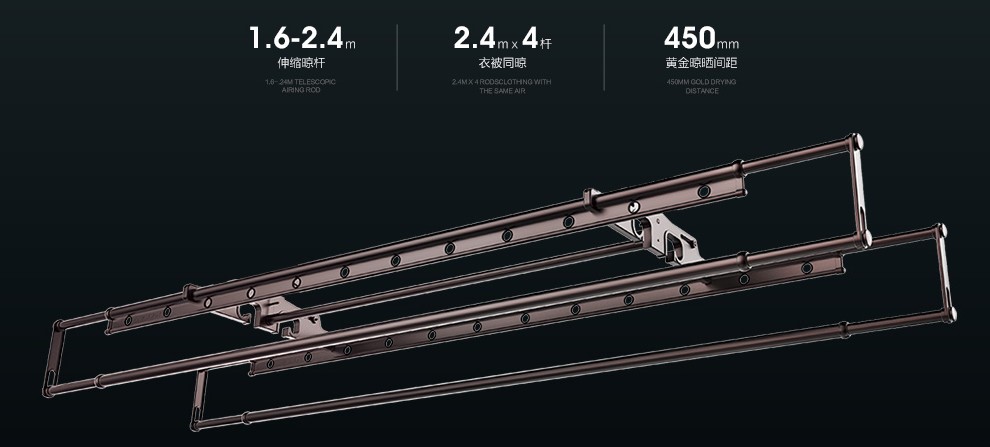 122系列在此基礎(chǔ)上加入了伸縮桿的設(shè)計,4根晾桿可自由伸縮,長度從1.6米加長至2.4米,晾曬容量增加50%,可實現(xiàn)同時晾曬10個人的衣物。