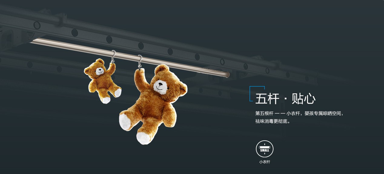 這還不夠,更驚喜的是,122系列擁有5根桿!利用2根晾桿間的空余空間,加了小晾桿。對于家里有孩子的家庭來說,非常實用了。