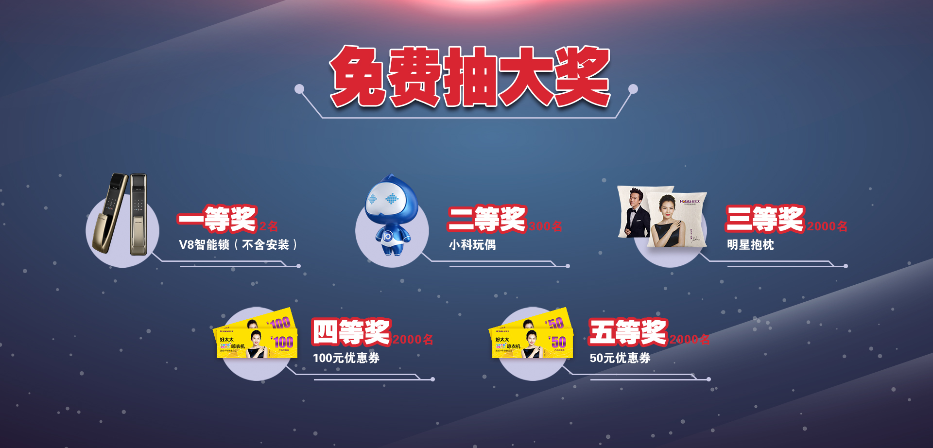 每日可免費(fèi)抽獎(jiǎng)一次,價(jià)值2998元的科徠尼高鐵專(zhuān)列版V8、明星抱枕、小科玩偶、100元/50元優(yōu)惠券天天送。