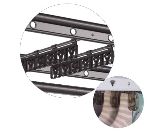 好太太奶爸機(jī),設(shè)計了6桿橫向的小晾桿,4排母嬰夾,與大人的晾衣空間不沖突,實(shí)現(xiàn)了寶寶的獨(dú)立晾曬空間。