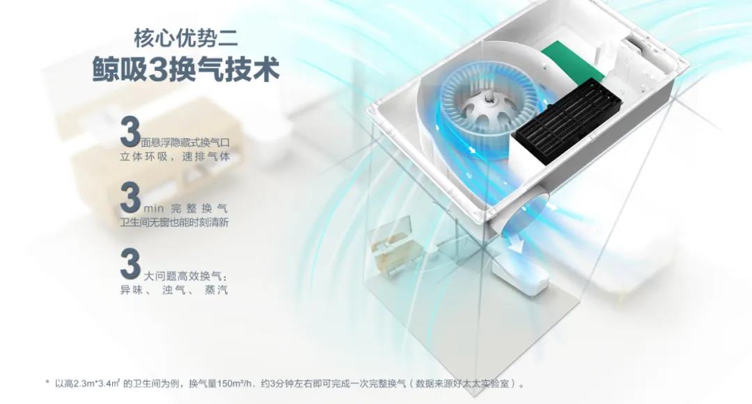 巨靈神三防電機(jī),防水防潮防腐蝕;鯨吸3換氣技術(shù),衛(wèi)生間無窗也能時刻清新;還有集美照明系統(tǒng),三大核心優(yōu)勢,令大家又多了一個理由選擇好太太智能浴霸!
