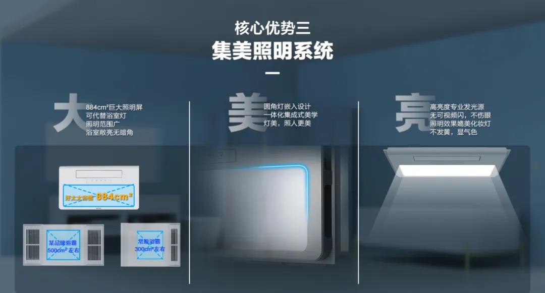 浴室燈也不將就!好太太智能浴霸,采用884平方厘米巨大照明屏,照明范圍廣,不傷眼,高亮度高顯色,媲美化妝燈,更顯氣色人更美!