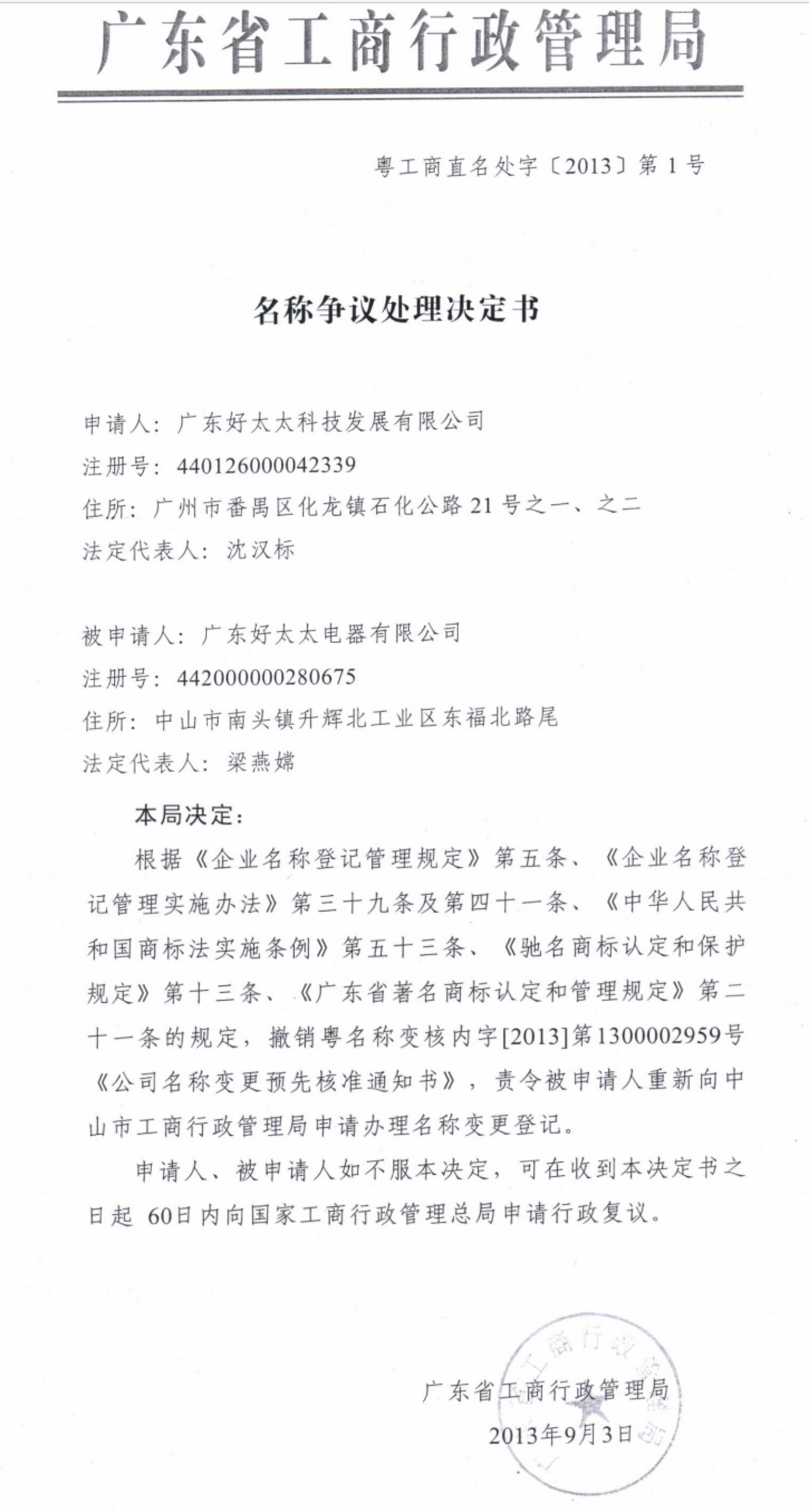 2009年11月20日,時稱中山市好太太電器有限公司的法定代表人老健明設(shè)立了中山市好生活電器有限公司,后于2013年1月30日更名為“中山市好太太電器有限公司”、于2013年2月27日更名為“廣東好太太電器有限公司”。因該企業(yè)名稱中再次使用“好太太”字號涉嫌不正當(dāng)競爭,被廣東好太太集團向廣東省工商行政管理局投訴,于2013年9月3日被廣東省工商局責(zé)令變更企業(yè)名稱。