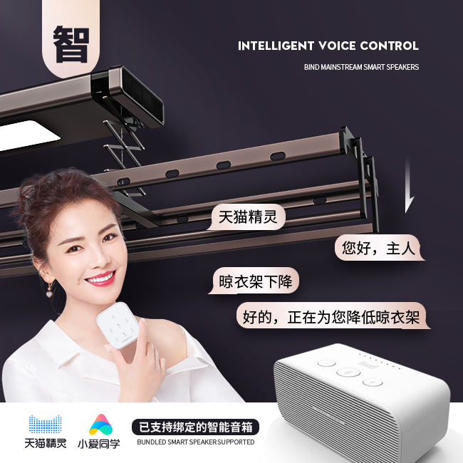 其實(shí),擁有智能控制系統(tǒng)則可以稱之為智能電動(dòng)晾衣架,包括但不限于語(yǔ)音控制、無(wú)線控制、遙控控制、App控制等。