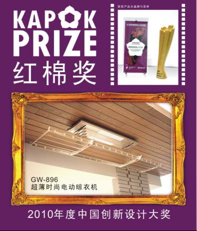 12月8日, 由廣州國際設(shè)計周組委會與中國工業(yè)設(shè)計協(xié)會聯(lián)合主辦的2010年度中國創(chuàng)新設(shè)計大獎“紅棉獎”評選活動頒獎典禮在廣州大劇院多功能劇場舉行,經(jīng)組委會國內(nèi)外專家評審,我司超薄電動晾衣機GW-896在眾多參賽作品中脫穎而出,獲得2010年度中國創(chuàng)新設(shè)計大獎“紅棉獎”。成為晾衣架行業(yè)唯一一款獲得該獎的產(chǎn)品,是各界權(quán)威對我司產(chǎn)品的高度認可,必將進一步推進我司在產(chǎn)品設(shè)計與研發(fā)能力上的不斷超越。